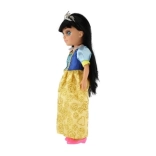Dukken har langt sort hår, blå øjne og bærer en smuk blå-gul kjole kombineret med lyserøde sko.