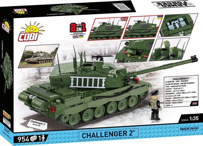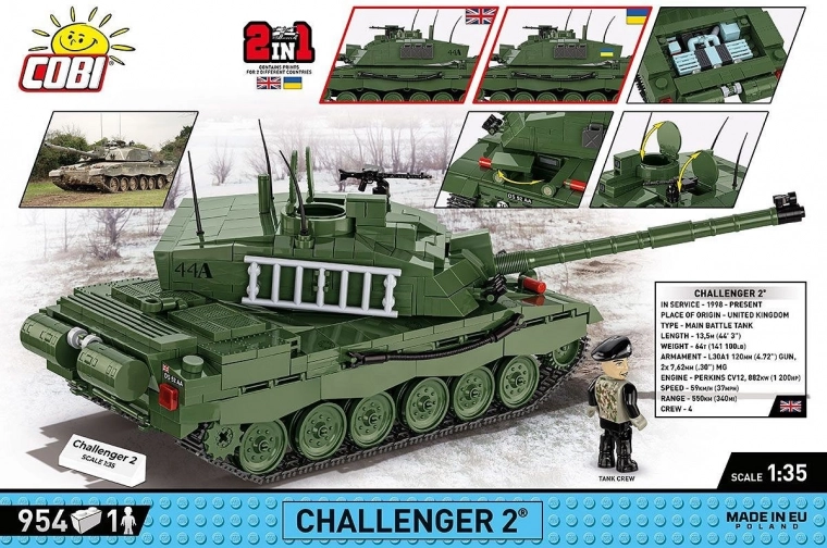 Åbn lugen i tårnet og placér den medfølgende tankmandsfigur med to varianter af hovedbeklædning (hjelm og baret med britisk emblem). Vælg mellem to sæt klistermærker og byg en britisk eller ukrainsk version. COBI-klodser er fremstillet i EU, har farveægte kvalitetsprint og er fuldt kompatible med andre mærker.
