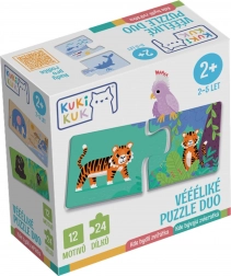 Opdag dyrenes verden på en legende måde med det lærerige sæt Véééliké puzzle duo. Børn forbinder de rigtige par dyr–miljø ved hjælp af formede samlinger, der viser, hvad der hører sammen. Sættet byder på 12 smukt illustrerede dyr i deres naturlige omgivelser og understøtter finmotorik, logisk tænkning, ordforråd og fantasi. Ideelt til børn 2–5 år. Fremstillet i Tjekkiet.