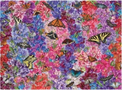Detaljerede illustrationer af sommerfugle i et blomsterlandskab med en rig palet af rosa, lavendel- og blåtoner, der fryder øjet og indbyder til at blive lagt.