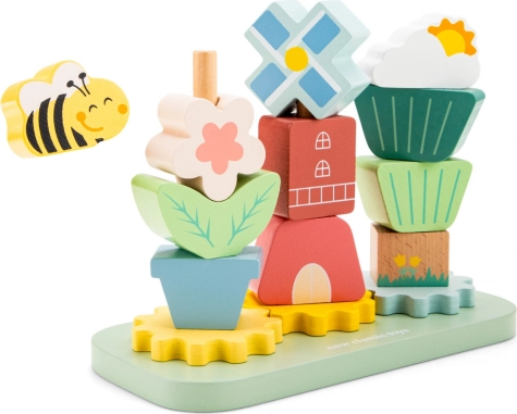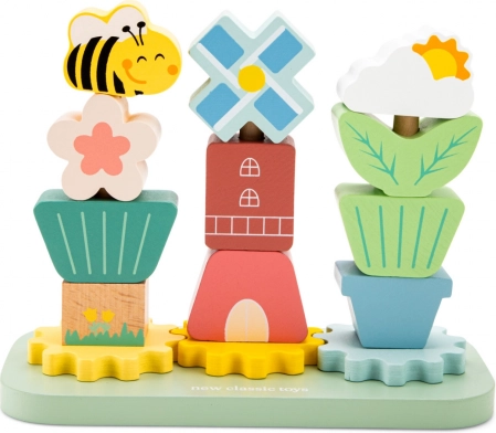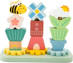 Træstablingslegetøjet Møllegård er ideelt til børn fra 12 måneder. Det indeholder farverige træbrikker af bøgetræ, som børn nemt kan stable. Kreativ leg understøttes af elementer som blomster, træer, vindmøller og bier, der kan sættes på en baseplade med pinde.