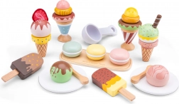 Legetøj til små is-elskere. Nyd forfriskende sjov med et træ-sliksæt, der indeholder ispinde, desserter i glas og kugleis.