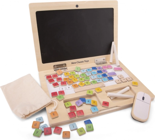 Lad dit barn opdage bogstaver og tal med denne træbårne laptop, som ikke kræver batterier eller opladere. Alle bogstaver, tal og taster er magnetiske, hvilket gør det nemt at fastgøre dem til den nederste del af laptopen.