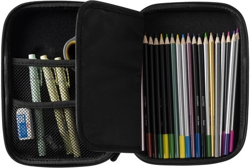To netlommer til småting, en indvendig flap med 6 stropper til skriveredskaber og et rummeligt hovedrum holder alting overskueligt på plads. Ideelt til både elever og kreative.