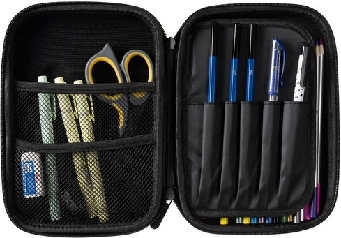 Indvendigt finder du en indvendig flap med 6 stropper til blyanter, kuglepenne eller tuscher, 2 netlommer til småting og et hovedrum, der rummer et sæt kreative materialer eller en tablet op til 8,5″. Flappen beskytter samtidig skærmen mod ridser. Penalhuset er ideelt til skole, rejser og som en praktisk organisator på hjemmekontoret.