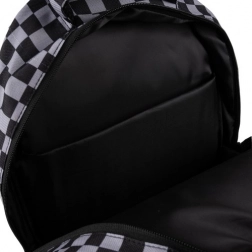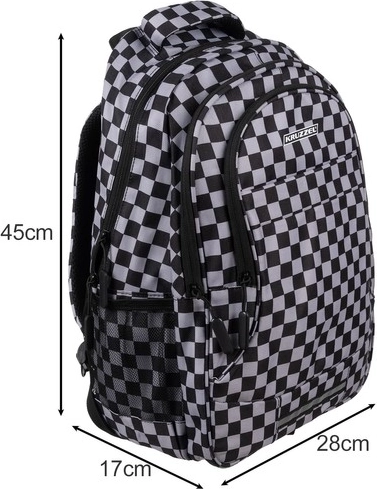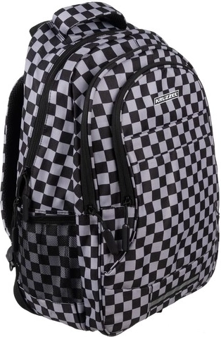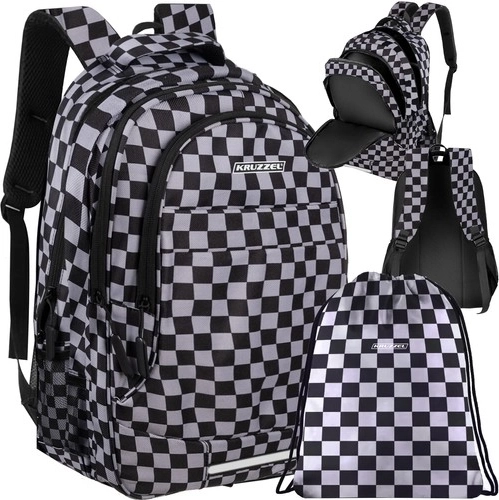 Leder du efter en alsidig skole- eller byrygsæk, som er holdbar, komfortabel og samtidig iøjnefaldende? Denne sort‑hvide skakternet KRUZZEL-rygsæk kombinerer robust Oxford 600D med åndbart rygpanel og EPE‑polstring for højere komfort og beskyttelse af indholdet. To mesh-sidelommer rummer en vandflaske, mens den forreste lomme og den reflekterende rem øger praktikalitet og sikkerhed efter mørkets frembrud.