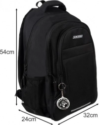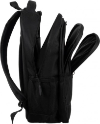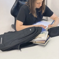 Hovedrummet med tovejs-lynlås rummer bøger, tøj og udstyr; indvendigt findes en polstret lomme til laptop/tablet. Det andet rum egner sig til flade og større materialer (hæfter, blokke). Forlomme til småting og to side-netlommer supplerer perfekt den daglige organisering.