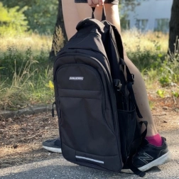 Rygsækken med stort volumen 45 l i slidstærkt stof Oxford 600D modstår mekanisk slitage og dårligt vejr. Indersiden er foret med Oxford 210D, og ryggen er over hele fladen udfyldt med EPE-skum for højere komfort og beskyttelse af indholdet mod stød. Der er også en reflekterende stribe for bedre synlighed.