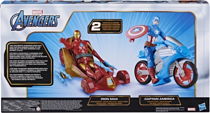 Iron Man og Captain America har deres egne køretøjer – en rød bil til Iron Man og en blå motorcykel til Captain America.