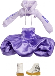 Denne dukke skiller sig ud med et lilla outfit med en skinnende nederdel og stilfulde leggings. Hendes lange lilla hår og trendy look er ideelt til modespil og styling.