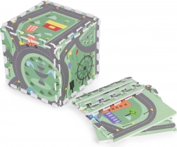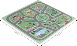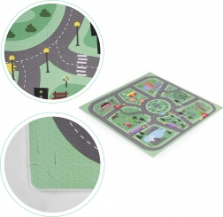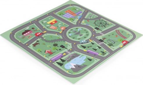 Det detaljerede motiv med veje, kryds og byelementer inspirerer børn til at finde på historier, køre med små biler og udvikle fantasi og finmotorik.