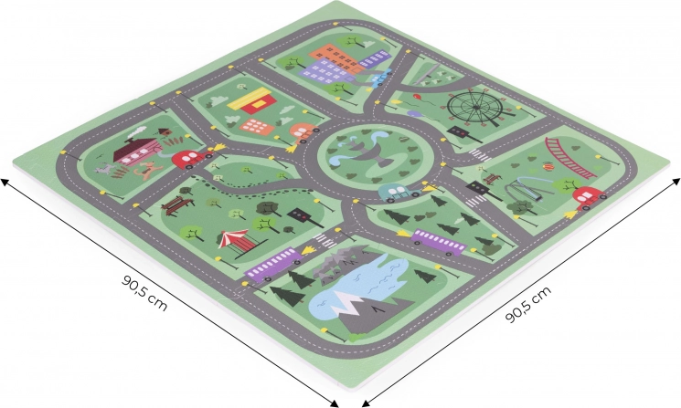 Denne kvalitets skummåtte med detaljeret bymotiv giver børn uendelige legemuligheder: veje, gader og kryds indbyder til køreture med små biler og til at finde på egne historier. Takket være en tykkelse på 1 cm er overfladen behageligt blød, dæmper stød og isolerer samtidig mod kolde gulve. Måtten er lavet af certificeret EVA-skum, som er let, holdbart og skånsomt mod børns hud.