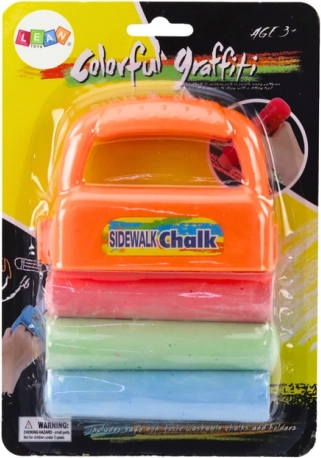 Sæt med kraftige fortovskridt med orange holder, 3 stk. Flerfarvede linjer med ét strøg, nemme at vaske af med vand. Velegnet fra 3 år, certificeret CE og EN 71.