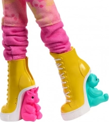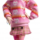 Dukkens outfit byder på et hjertevarmt og lagdelt look fyldt med farverige og stilfulde elementer.