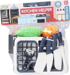 Oplev sjov i køkkenet med dette søde børnekøkkensæt! Sættet inkluderer ikke kun en vask og en afdryppelsesbakke til realistisk leg, men også forskellige køkkenværktøjer som tre knive, en knivsliber og et skærebræt. Sættet inkluderer også en skrællekniv og flere stykker mad som delbar gulerod, majs og græskar, der muliggør realistisk leg.