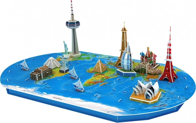 På kortet finder du verdensikoner som Eiffeltårnet, Operaen i Sydney og Frihedsgudinden samt mange flere. Den færdige model måler ca. 65,4 × 40,6 × 24,7 cm og egner sig perfekt som dekoration til børneværelset eller legeområdet.