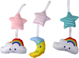 Den rosa karrusel med himmelmotiv vil glæde enhver baby. Takket være den praktiske clips fastgør du den nemt på kanten af tremmesengen, barnevognens bøjle eller bæreselens stropper. De blide farver og de bløde teksturer på plysdyrerne fanger opmærksomheden og hjælper med at berolige barnet.