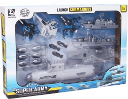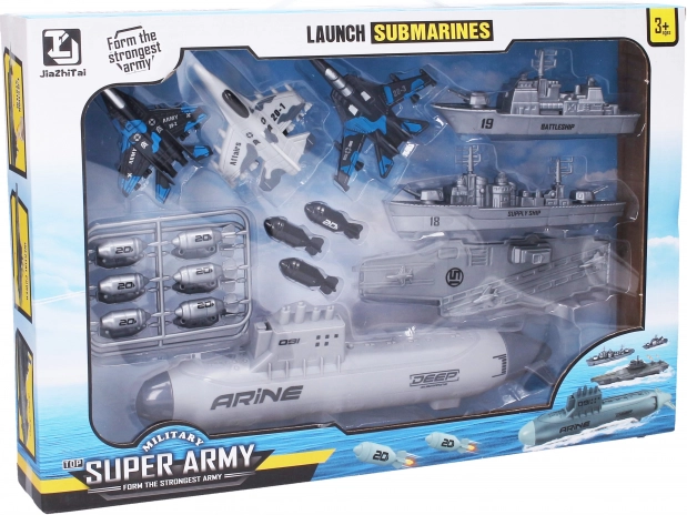 Sjovt legesæt for små sømænd bringer en realistisk ubåd med fungerende torpedoaffyrer, svinghjul for hurtig start samt en flåde af skibe og fly til actionfyldte slag. Sættet indeholder 9 torpedoer, et hangarskib, et slagskib, en slagkrydser og 3 jagerfly – alt klar til øjeblikkelig leg.