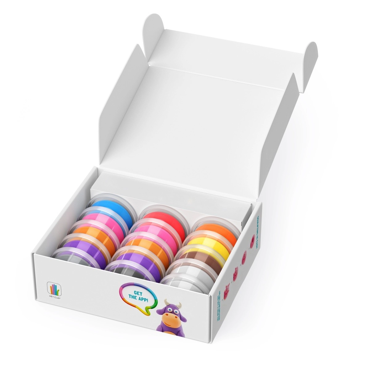 Sættet indeholder 15 bøtter blød modellervoks og digital trin-for-trin-vejledning i appen til Android og i iOS. Materialet er sikkert for børnehud og egnet til gentagen leg – læg blot ubrugt masse i en tætsluttende bøtte.