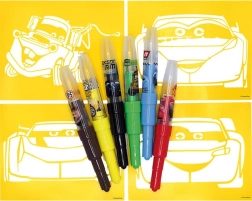 Oplev sjov med blæse-tuscher Cars - Biler, som indeholder seks farvede blæse-tuscher og fire farvede pap-skabeloner inspireret af populære eventyrmotiver.