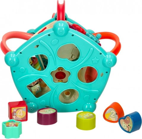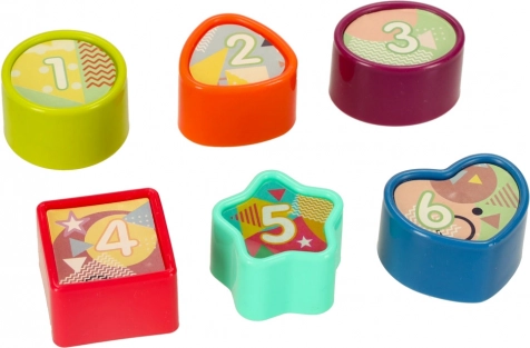 Seks farvede klodser og matchende åbninger lærer børn at genkende former, farver og tal. Understøtter logisk tænkning og rumlig orientering.