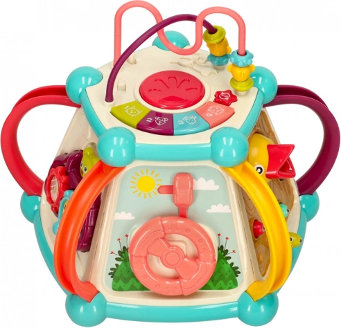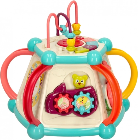 Klaver, rat og roterende hjul stimulerer kreativitet og fantasi og styrker samtidig fingrenes smidighed. Hver side af kuben byder på en ny aktivitet.