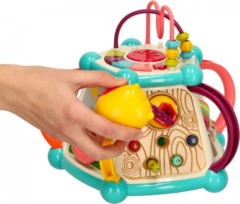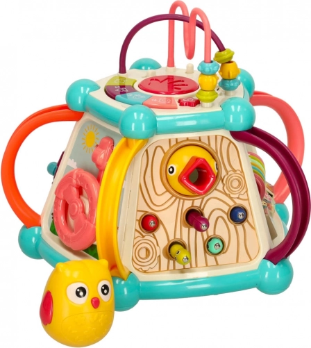 Takket være den robuste plastkonstruktion af ABS og PP er kuben sikker og holdbar. Sjove elementer som tandhjul, klaver, rat, skydende perler og roterende blokke med dyr fastholder opmærksomheden og udvikler bevægelseskoordination. Der medfølger også en formsorterer med seks klodser og det originale spil “fodr fuglen” med orme og en lille ugle til træning af præcision.