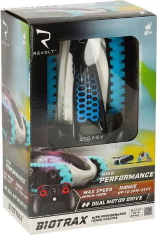 Oplev den kompakte bæltegående RC-bil REVOLT BIOTRAX, som klarer både tæppe og udendørs terræn. Takket være den robuste konstruktion, gummibælter, styring på 2,4 GHz og en hastighed på op til 8 km/t byder den på dynamisk og pålidelig underholdning. En intuitiv controller og LED-belysning forstærker køreoplevelsen både inde og ude.
