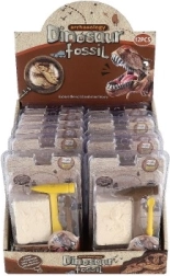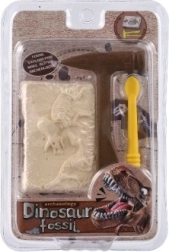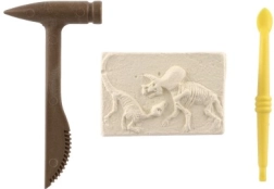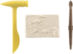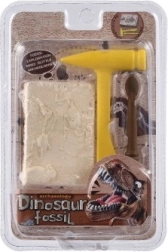 I pakken finder du en blok med et aftryk af en dinosaurknogle og nødvendige værktøjer til udgravning - en plastikhåndhammer og mejsel.