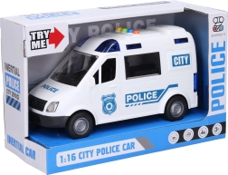 Denne politibil er udstyret med lys- og lydeffekter, som aktiveres via knapper på kabinen. Børn kan lege realistisk med åbningsbare for- og bagdøre. Bilen drives af en friktionsmotor, hvilket sikrer en glidende kørsel.