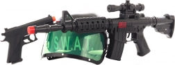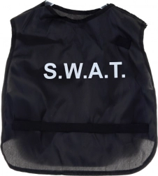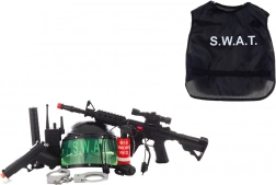 Politisættet indeholder hjelm, vest, maskinpistol, walkie-talkie, pistol, knippel, håndjern, høretelefoner og granat. Materiale: plast. Pakket i en gennemsigtig plastemballage. Emballagens mål ca. 52×34×12 cm. Veststørrelse 34×37 cm. Alder 3+