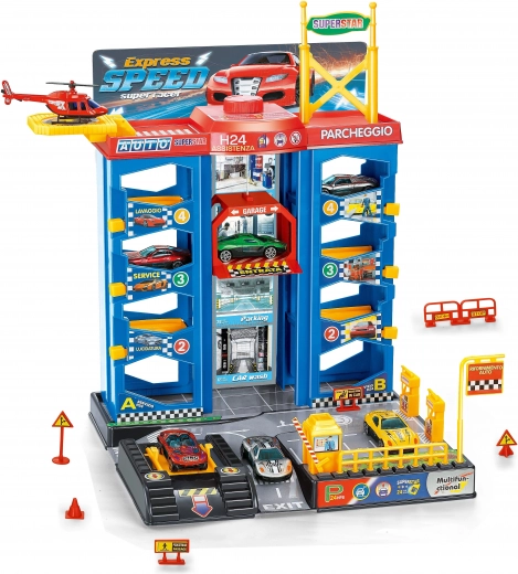 Denne detaljerede parkeringsstation giver børn en realistisk leg med bytrafik. Takket være de robuste metalbiler og helikopteren får de masser af action fra landing på helipaden til tankning ved stationen. Den mekaniske håndtag ved parkeringspladserne gør det nemt for bilerne at køre glat ud af garagen.