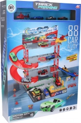 Denne detaljerede parkeringsstation er ideel til små motorentusiaster. Den omfatter en helipad til helikopterlanding, tankstation og funktionelle elementer, der understøtter fantasi og finmotorik.