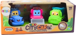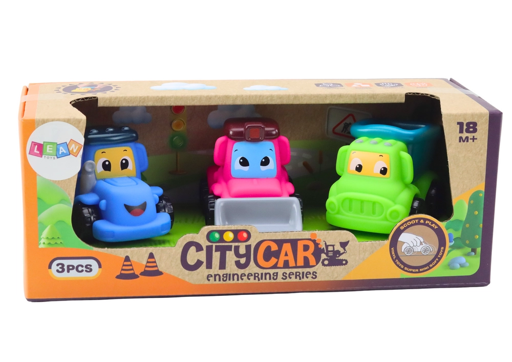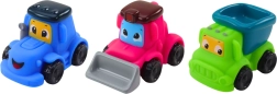 Et sæt med 3 landbrugsbiler er et fantastisk legetøj til børn, som giver mange timers sikker og kreativ leg. Køretøjerne er lavet af blød gummi og holdbar plast og har ingen skarpe kanter eller små dele, så de trygt kan gives til selv de mindste børn. Sættet indeholder tre søde køretøjer: en traktor, en bulldozer og en dumper, hver med et venligt smilende ansigt, som straks vækker sympati og inviterer til leg.