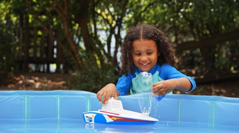 Den største sjov er det vandkanon med mekanisk pumpe, som virkelig sprøjter vand. Fyld vand og pump – så er indsatsen i gang! Båden er lavet af kvalitetsplast, har intense farver og en robust udførelse for lang holdbarhed. Derudover kan man på skroget fastgøre en lille katamaran (ikke inkluderet) og udvide legetemaet.