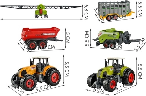 Oplev det sjove liv på landet med dette store sæt af landbrugskøretøjer. To traktorer, tiptrailer, sprøjte, presser og dyretrailer byder på realistiske detaljer, bevægelige dele og mulighed for sammenkobling til kreativ og lærerig leg. Holdbare materialer sikrer sikker og langvarig brug.