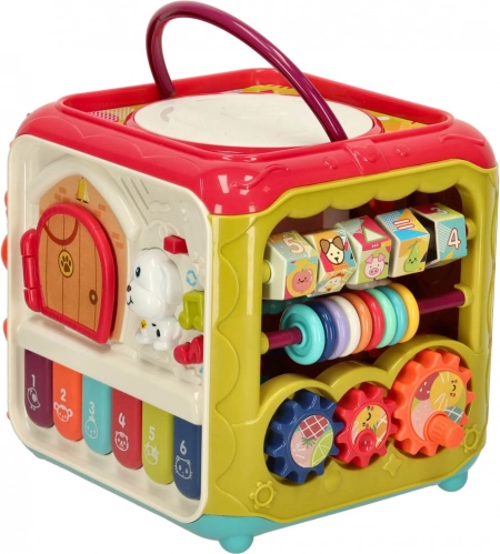 Den farverige interaktive 6-i-1 terning BIBI-INN giver timevis af leg og læring i ét. Hver side byder på en ny aktivitet – fra børneklaver med dyrelyde til formsortering, tandhjul, kugleramme og spillet “fodr fuglen” med magnetiske biller. Støtter finmotorik, koordination og genkendelse af farver, former og tal.