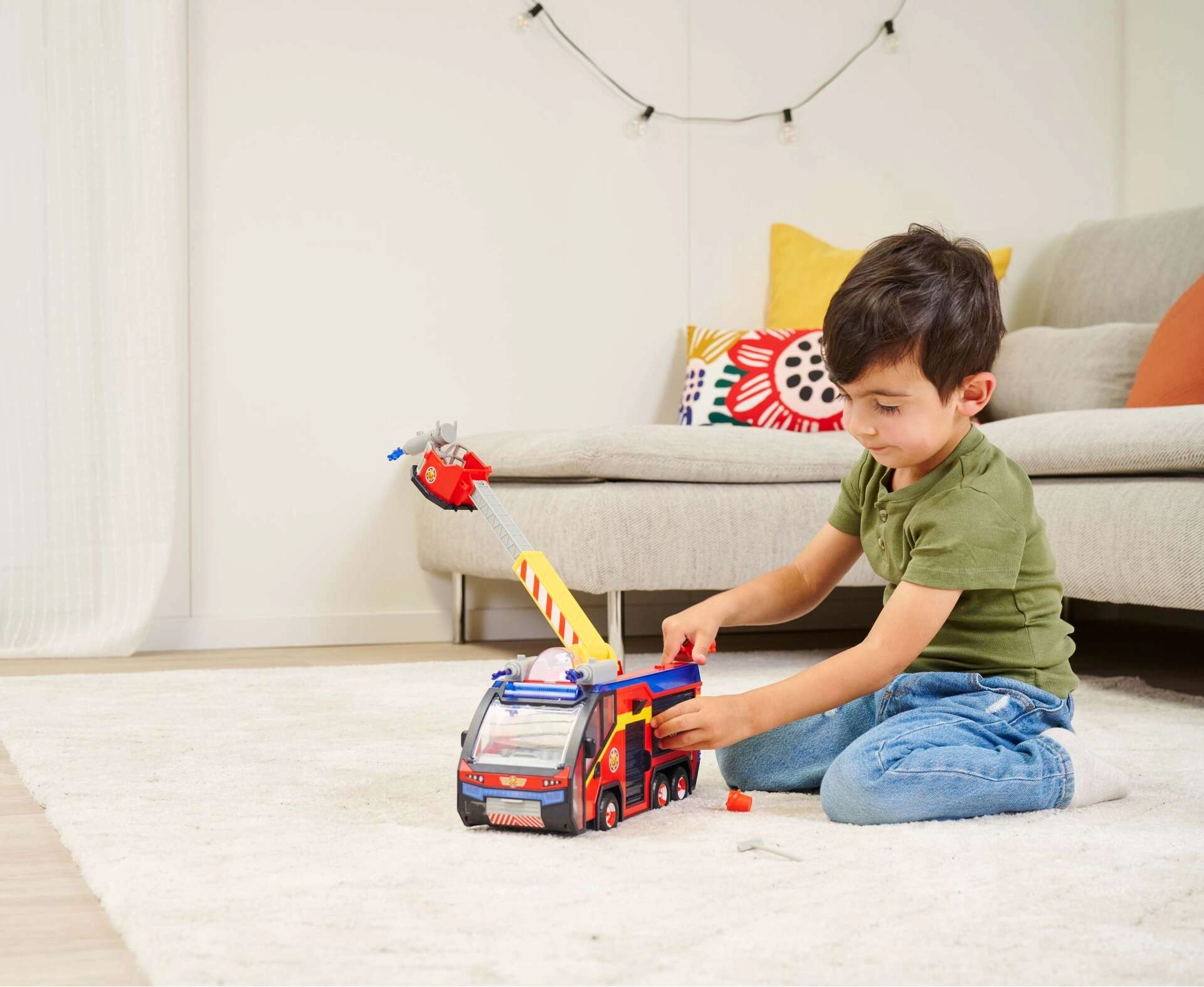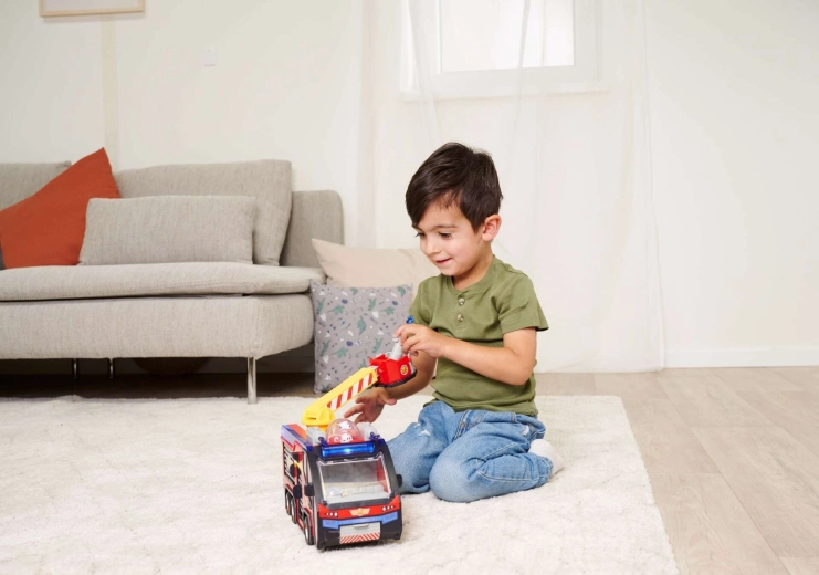 - Lys- og lydeffekter: Brandbilen afspiller realistiske lyde og har spektakulær 360° belysning, som giver en realistisk ramme for legen. Udtrækkelige opbevaringsrum til værktøj. På taget er der en åbningsbar kabine til hunden.