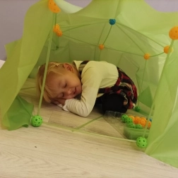 Byg din egen hemmelige base, kuppel, tunnel eller telt – fantasien sætter grænserne. Holdbare plaststave og robuste kugleledskonnektorer gør det muligt at skabe stabile konstruktioner, som kan dækkes med den medfølgende grønne presenning. Takket være de fluorescerende sugerør er værkerne iøjnefaldende selv i dæmpet lys.