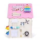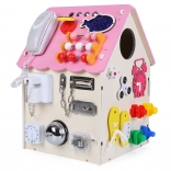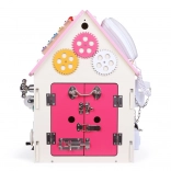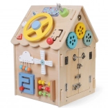 Interaktivt træhus med mange elementer til sanseundersøgelse og læring, der udvikler finmotorik, hånd–øje-koordination og selvstændighed. Børn øver på en sjov måde at knappe, binde, skifte, dreje og låse op, og samtidig bliver de bekendt med kugleramme og ur.