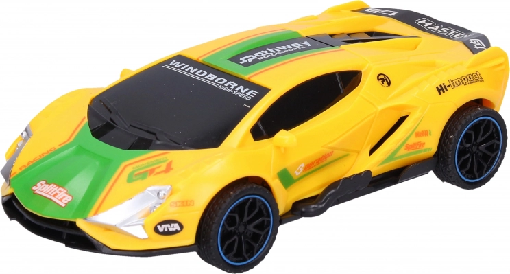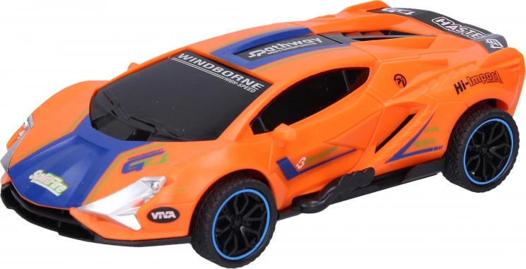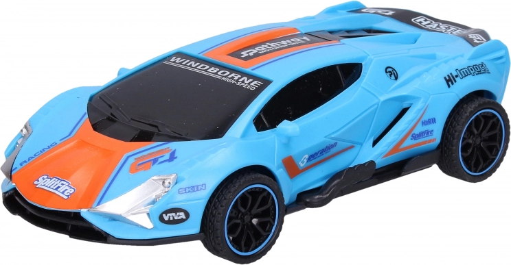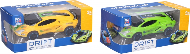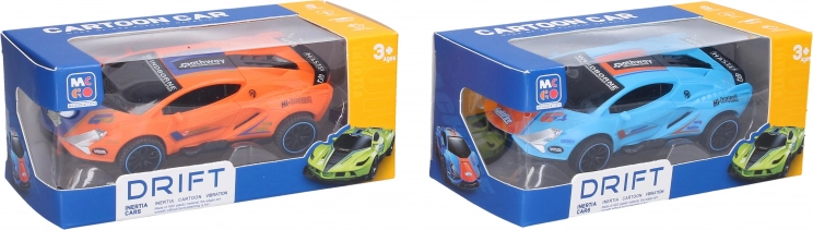 Driftende racerbil med friktionsmotor i målene 15,5 × 8 × 4 cm. Det er nok at sætte den i gang, og takket være det lodret placerede hjul midt under chassiset drifter den af sig selv. Fås i 4 farver – blå, grøn, orange, gul; sjov uden batterier.