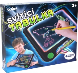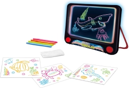 Denne lysende tegnetavle er et fantastisk redskab til små kunstnere. Den er udstyret med farvede viskbare tuscher og skabeloner, som gør det muligt for børn at udvikle kreativiteten og samtidig lege. I pakken medfølger også en rengøringsklud, så man nemt kan begynde på et nyt værk.