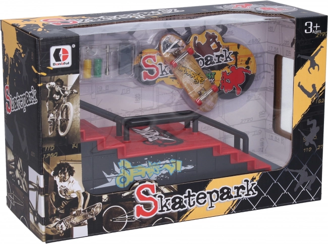 Fingerboard-sæt med trapper: komplet fingerboard og trapper med gelænder, ideelt til tricktræning. Trappernes mål 23,5x10x9,5 cm.