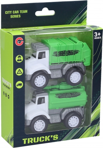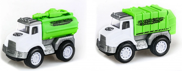 To realistiske oprydningsbiler med friktionsdrev til leg uden kabler og batterier. Praktisk sæt med 2 stk i kompakte mål 10,3 × 5 × 6,8 cm ligger godt i hånden og stimulerer kreativ leg. Ideel til små køretøjsentusiaster – uden batterier, skub dem blot og kør afsted.