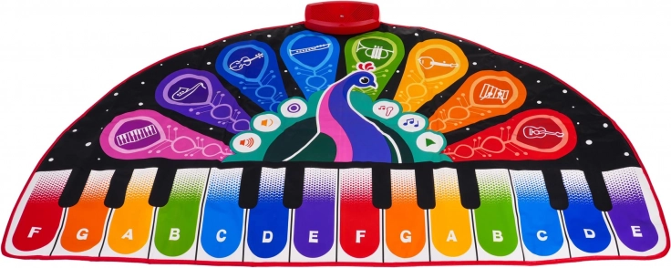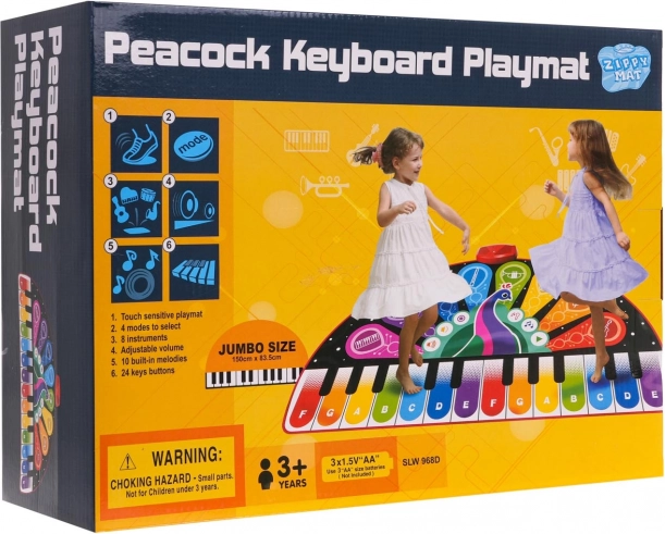 Musikalsk legetæppe Påfugl fra Zippy Mat er fantastisk underholdning for børn fra 3 år, som kombinerer bevægelse og udvikling af musikalske færdigheder. Dette farverige tæppe med 24 tangenter og otte forskellige instrumenter, som klaver, vibrafon og guitar, giver børn timevis af interaktiv musikleg.
