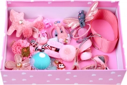 Stilfuld lyserød æske dekoreret med hvide hjerter til opbevaring af alle tilbehør ét sted.