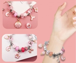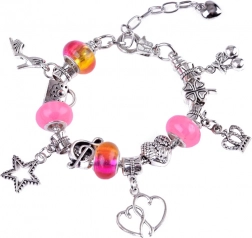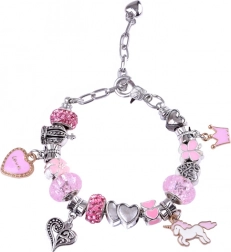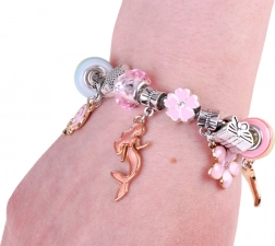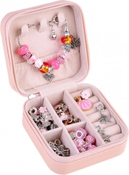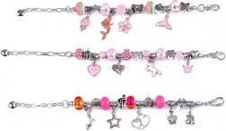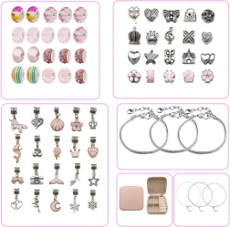 Sættet indeholder alt nødvendigt til at lave smukke armbånd og halskæder: forskellige perler, vedhæng og snore.