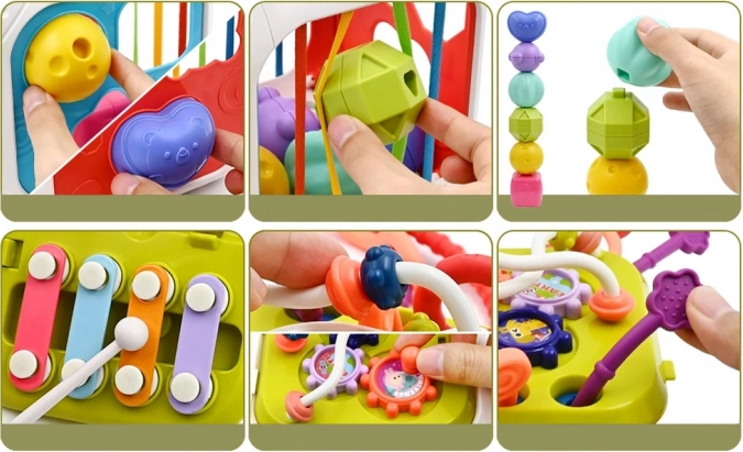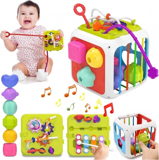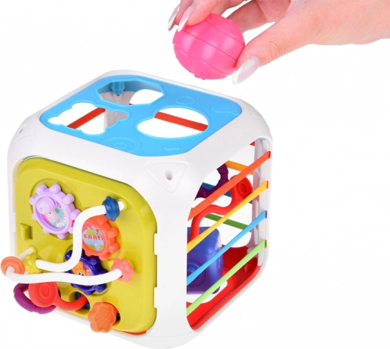 Denne farverige pædagogiske terning i kvalitetsplast kombinerer børns yndlingsaktiviteter i én kompakt enhed. To sider fungerer som formsorterer med forskellige åbninger, tre andre er udstyret med elastiske bånd til at presse klodser igennem og træne berøring. Det dobbeltsidede panel tilføjer cymbaler/klokkespil og træksnore med forskellige teksturer på den ene side samt tandhjul og skydende perler på den anden.