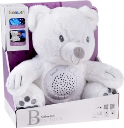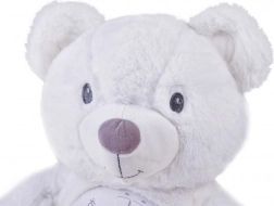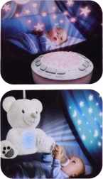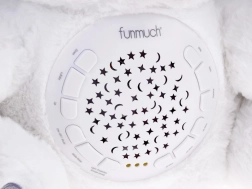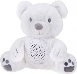 Denne bløde hvide bamse kombinerer legetøj og natlys i ét. Med 6 blide vuggeviser og 5 autentiske naturlyde hjælper den dit barn med at falde til ro og føle sig trygt. Den farverige projektion af stjerner og måne skaber en beroligende atmosfære på vægge og loft, som jager mørket væk og fremmer en rolig søvn.