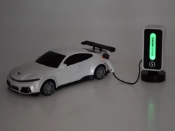 Med følger en opladningsstation drevet via USB, som gør det nemt at fylde bilen med strøm hvor som helst. På bilens underside kan du desuden justere hastigheden for sikker og jævn kørsel.